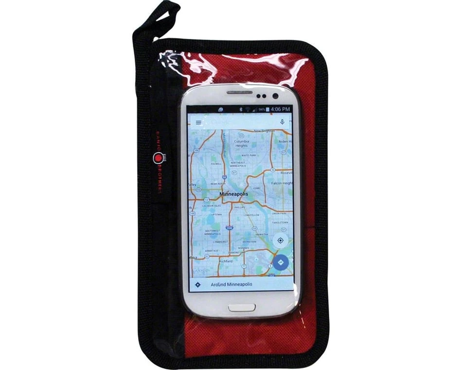 A protective pouch for electronics or water-sensitive items, with touch-screen compatible front window, zipper closure and pockets for ID and a key on the back.
