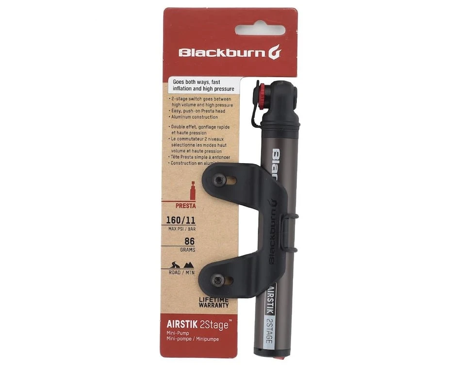 No matter if you’re on a road bike or mountain bike, the Blackburn Airstik 2 Stage Mini-Pump can handle the demands of tire inflation in the event of a flat. Thanks to a two-stage, high pressure/high volume switch, the pump can quickly be configured to handle high pressure road tires as well as high volume mountain tires. The mini-pump features aluminum construction for light weight as well as durability and sports a pump head that’s configured for Presta valves only.