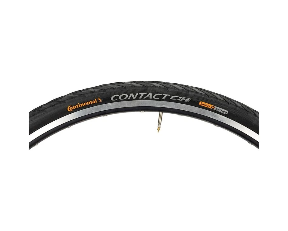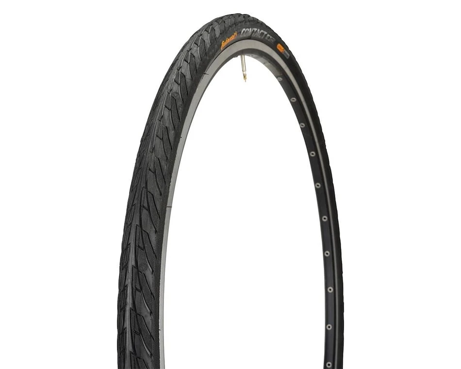 Designed to handle the rigors of city cycling, but tough enough for paths and dirt roads, the Continental Contact City Tire places a premium on durability and puncture resistance. Its tread pattern ensures low rolling resistance for straight-line speed while the edges deliver ample traction in wet conditions or on dirt roads. Continental’s SafetyPlus Breaker puncture-resistant belt helps reduce the occurrence of flats, particularly of importance when venturing out on rougher surfaces, while a variety of size options for 26″ or 700c diameter wheels ensure there’s a Contact City Tire for your bike.