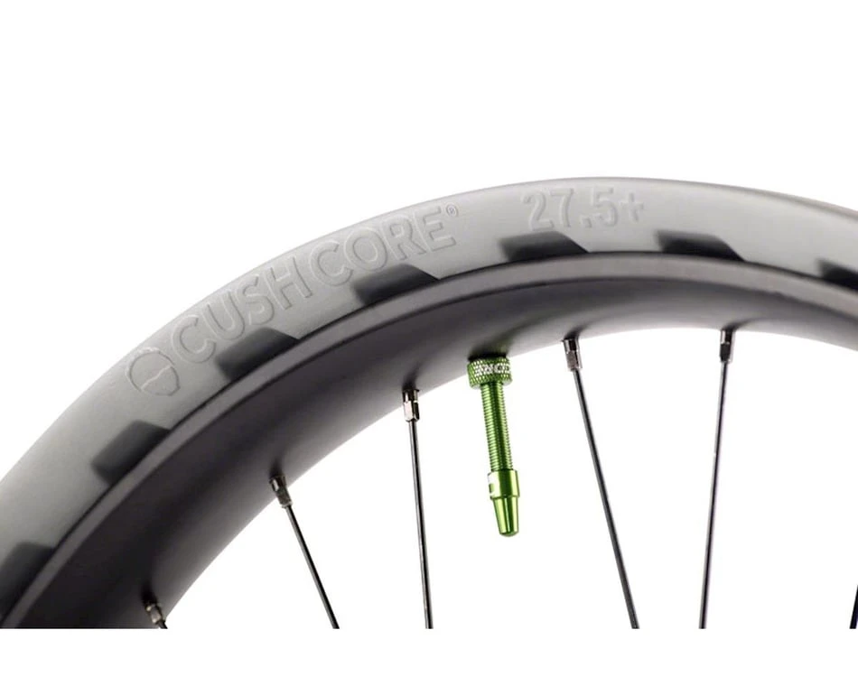What is CushCore exactly? – An engineered foam insert that mounts inside a mountain bike tire. It divides the inner volume of the tire in half, with air underneath the tread and the CushCore insert next to the rim. It absorbs impacts, reduces vibration, and adds lateral stability to the tire. This system is designed to be used with tubeless-ready or tubeless converted mountain bike rims and tires, as well as standard tubeless sealant. A specially designed tubeless air valve is included with each insert. The air valve allows air to move through the valve without becoming obstructed by the insert.