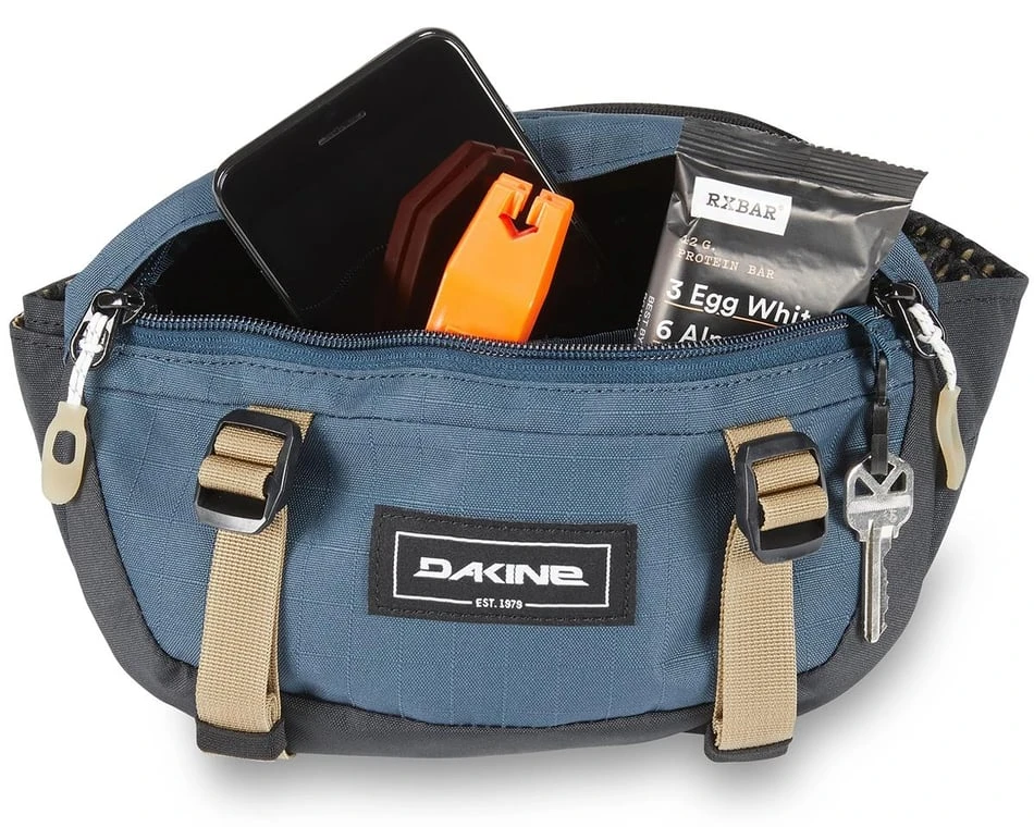 The Dakine Hot Laps 1L hip pack utilizes an ultra-intentional design that features a single deployable water bottle pocket, external straps for pads, and one cargo pocket with organization for tools, a tube, and snacks. Its compact size will stay put through the jankiest tech sections, but its deliberate functionality ensures you’re repair-prepared. For those with a dialed kit, this is the ideal piece for everyday rides.
