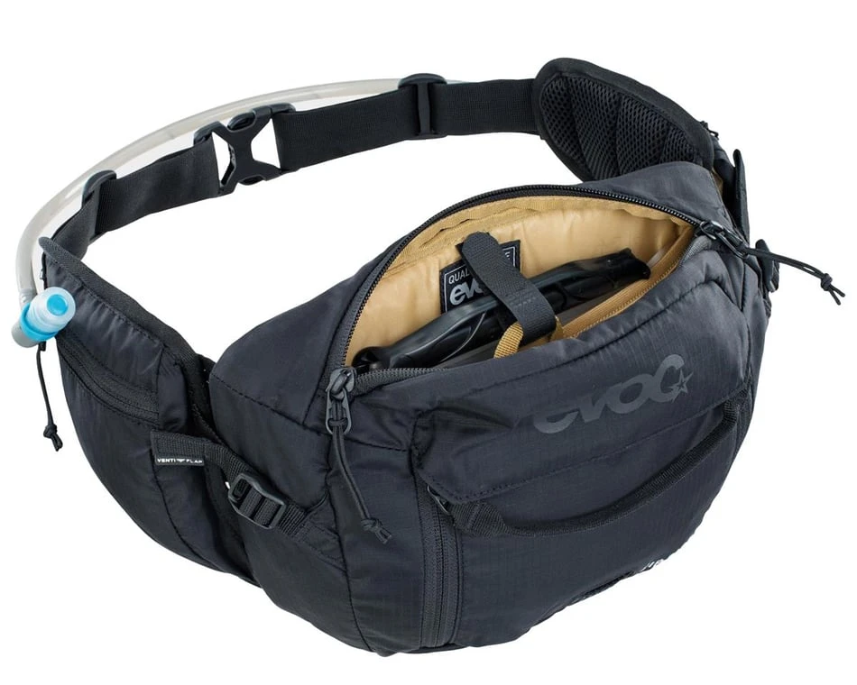 The EVOC Hip Pack 3 Liter Hydration Pack has just what you need without the extra fluff. Store a tube and tools in the separate tool compartment, fill the 1.5L bladder and youโre ready to hit the trails or road. Thanks to the Venti Flap system you can individually adjust the distance of the fannypack to your back and the ventilation along the back panel.