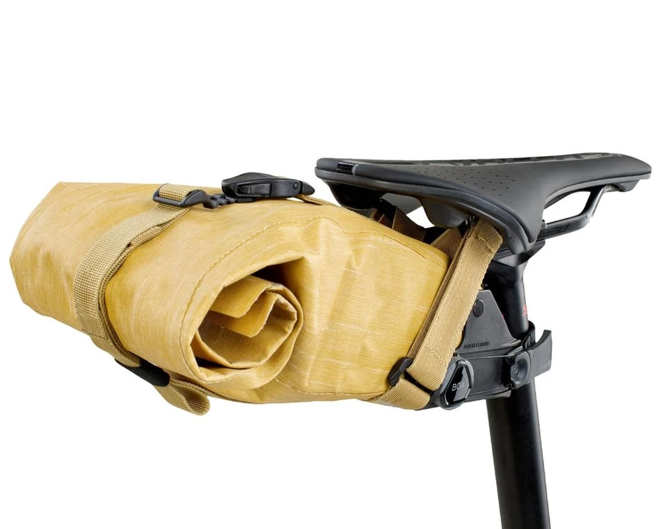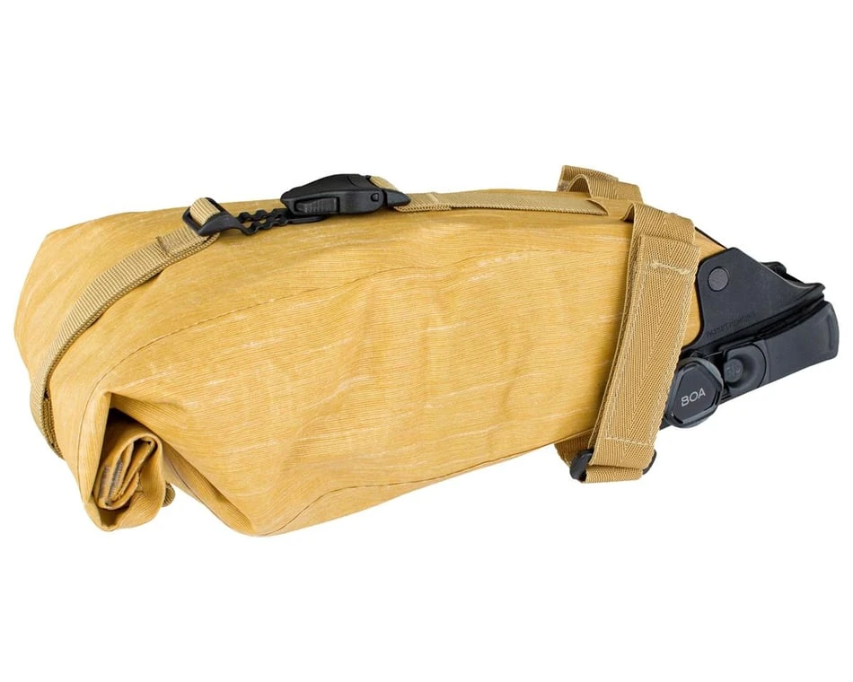 The EVOC Seat Pack Boa saddle bag provides adjustable capacity via a roll-top closure. This 100% waterproof bag is versatile enough to store a wide variety of essentials, perfect for long days in the saddle or unpredictable conditions. The flexible main compartment closure adjusts to the bag size, to snuggly carry as much or as little as you require. Soft TPE seatpost protection, and dropper post compatibility, with a Boa Fit System for easy and secure fixation.