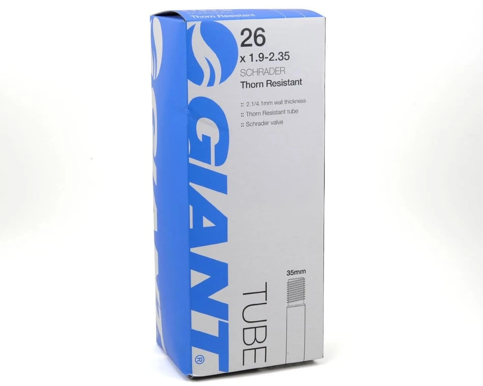 This is a Giant 26″ Thorn Resistant Inner Tube with Schrader Valve. This tube features an extra thick 2.1/4.1mm wall for increased puncture resistance compared to a standard tube.