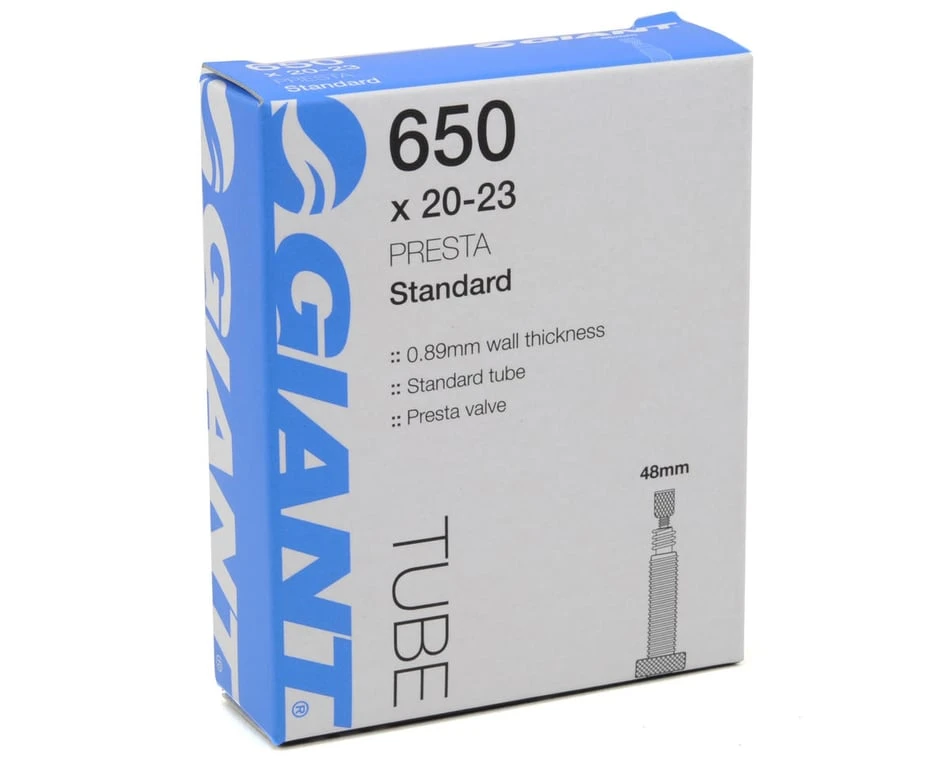 This is a Giant 650c Standard Inner Tube with a Threaded Presta Valve Stem. It features a .89mm wall thickness.