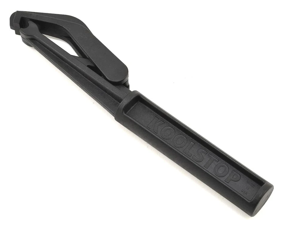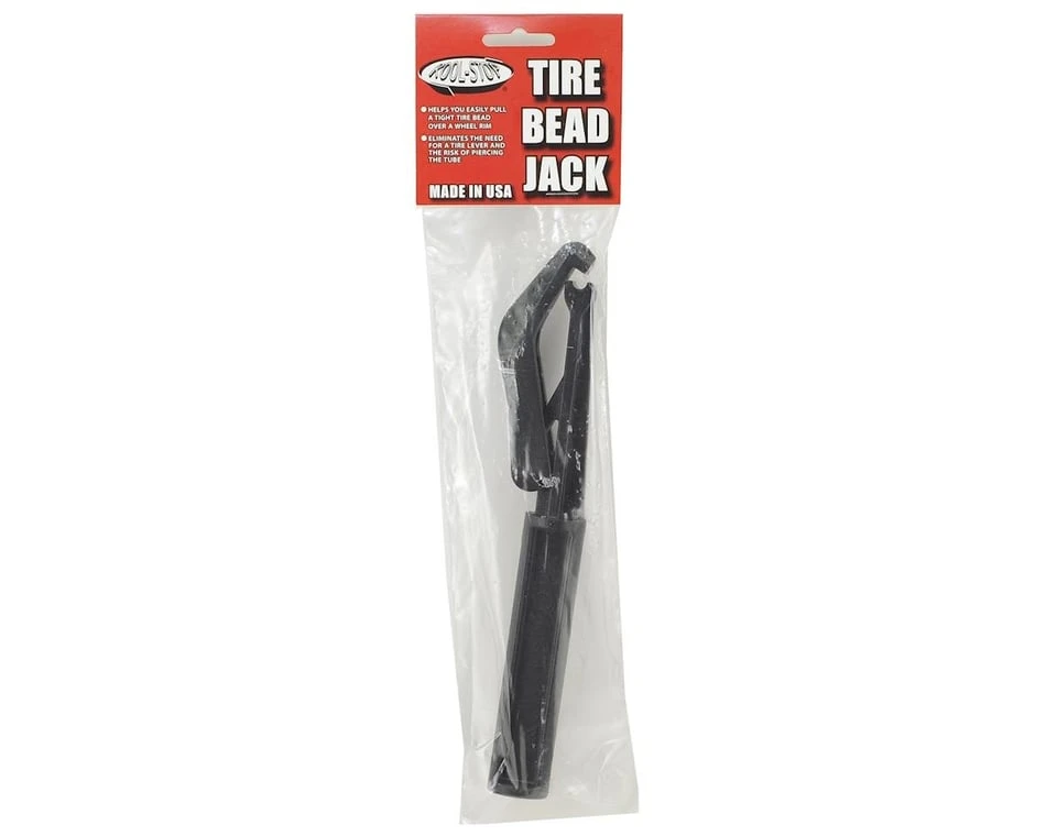 The Kool Stop Tire Bead Jack is an articulated tool, with a comfortable grip, for installing really tight tires. The articulated end uses the rigid piece against the rim edge as a fulcrum while the hinged end lifts the bead up and over the opposite edge of the rim. This is a great tool for dealing with difficult tires.