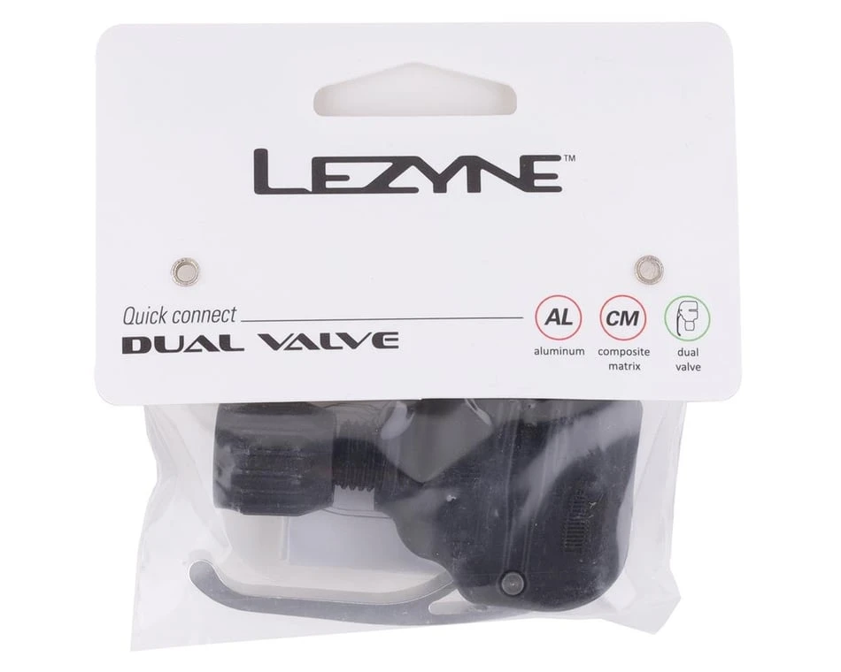 The Lezyne Dual Valve Pump Head is engineered with durable Composite Matrix and aluminum construction. It features a large, ergonomic aluminum locking lever and a rebuildable design that allows for seals to be replaced. Compatible with all high pressure floor pumps, the Dual Valve head is excellent for Presta, Schrader, and Dunlop valves. Valve type indicators are molded directly into the body.
