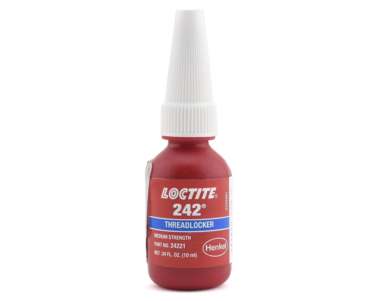 Loctite 242 is a medium strength, medium viscosity threadlocking compound used for metal thread sizes from 1.5mm to 36mm in diameter. “Blue” or “Medium” is used commonly across all RC applications where metal to metal fixture points are found, and can be removed with ease. 242 specifically requires a clean application surface for best results and bonding properties. Fixture drying times (depending on materials) are up to 20 minutes at maximum. Full cure is 24 hours.