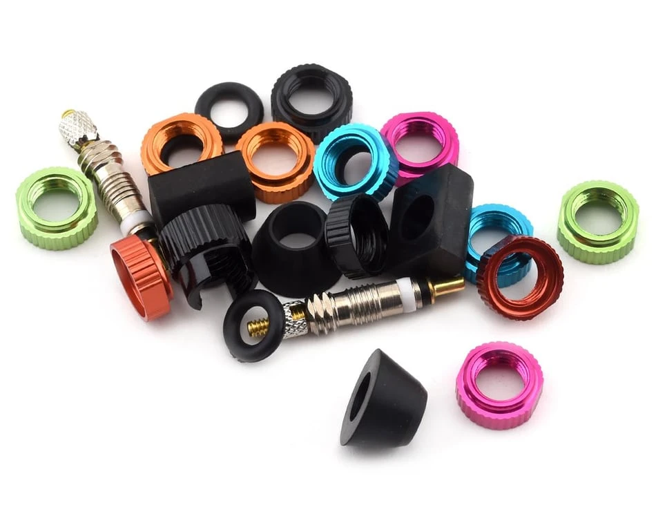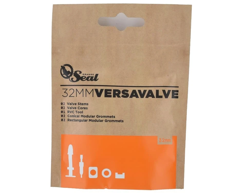 The Orange Seal VersaValve Stem Kit works on most rims; mountain, road or CX. The sturdy base plate ensures solid contact with the rim bed, and the rubber grommets with various shapes provide an airtight fit on all rim shapes and depths. Kits available in 32mm, 48mm, 60mm, and 80mm valve lengths and includes multiple colored stem nuts.