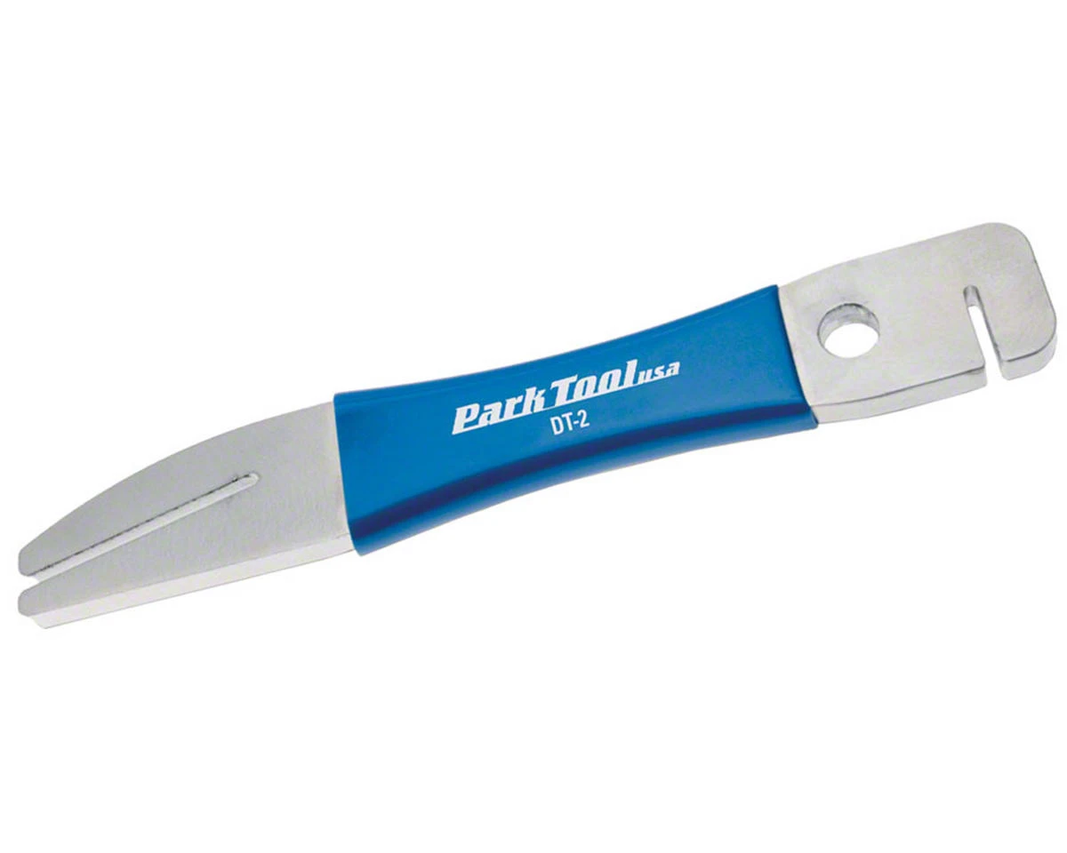 This is the Park Tool DT-2 Rotor Truing Fork. Specially designed, and precisely manufactured to gently adjust bent or damaged brake rotors. Each DT-2 features two different slot depths laser cut from high quality steel. Centered handle is vinyl dipped for comfort.