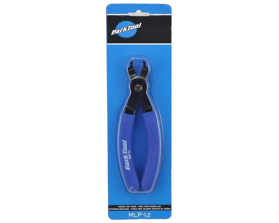 This is the Park Tool MLP-1.2 Master Link Pliers. Many derailleur chains use a “master link” that allows the chain to be installed and removed by hand. While this type of masterlink doesn’t require a traditional chain tool, over time, dirt and corrosion can make it difficult to separate by hand. MLP-1.2 Master Link Pliers make removal and replacement of these masterlinks quick and effortless. Simply insert the specially sized jaws into the masterlink and squeeze the handles.