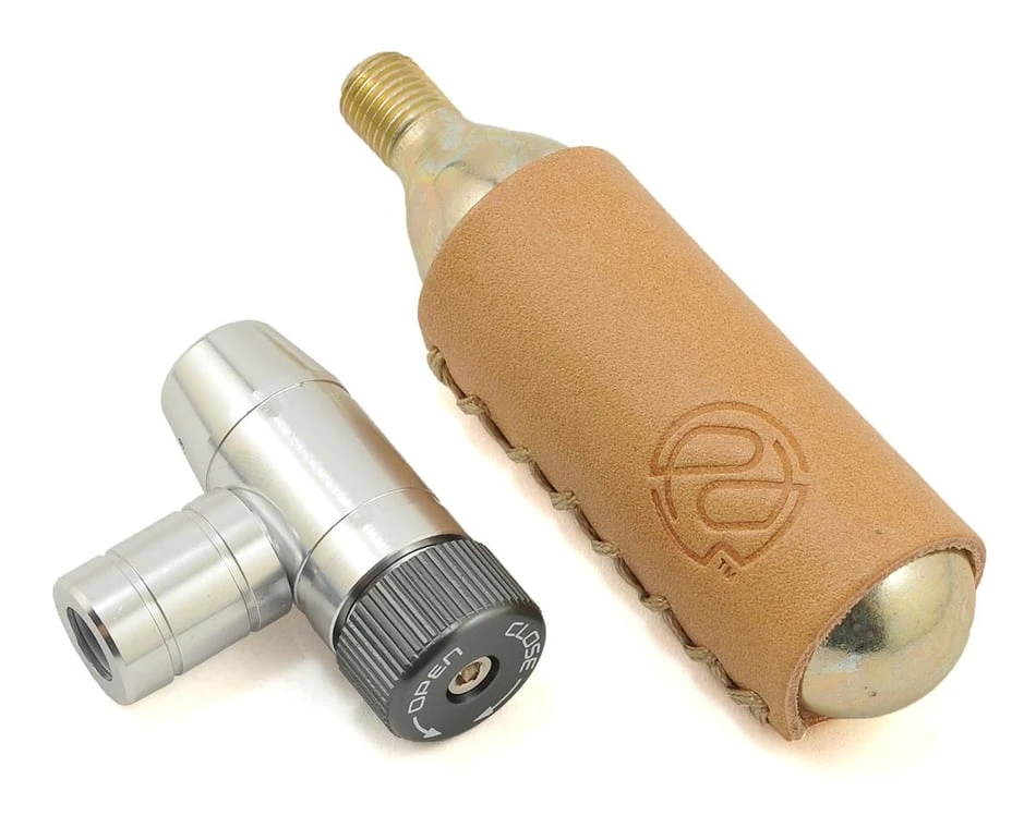 Inflator with vegetable tanned leather sleeve and 16g CO2 cartridge. Don’t forget to pick up additional CO2 cartridges.