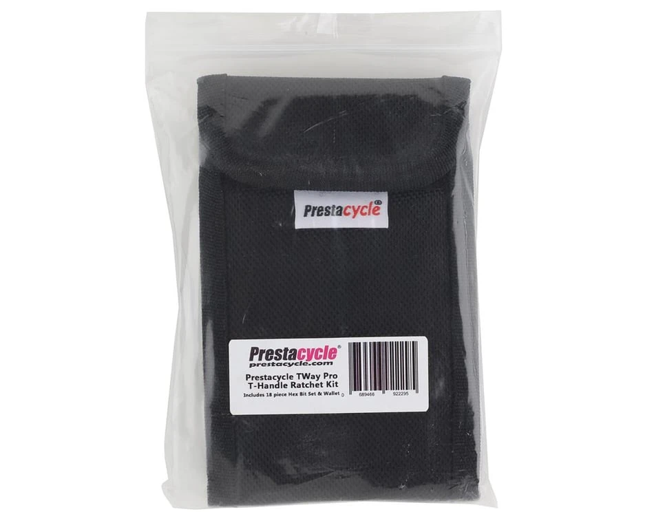 The Prestacycle Fixit TWay Pro Ratchet Kit provides users with a system that has the stability of a T-handle wrench and the efficiency of a reversible ratchet. The kit includes a T-handle ratchet and 18 S2 hardened steel bits housed inside a convenient wallet sized case.
