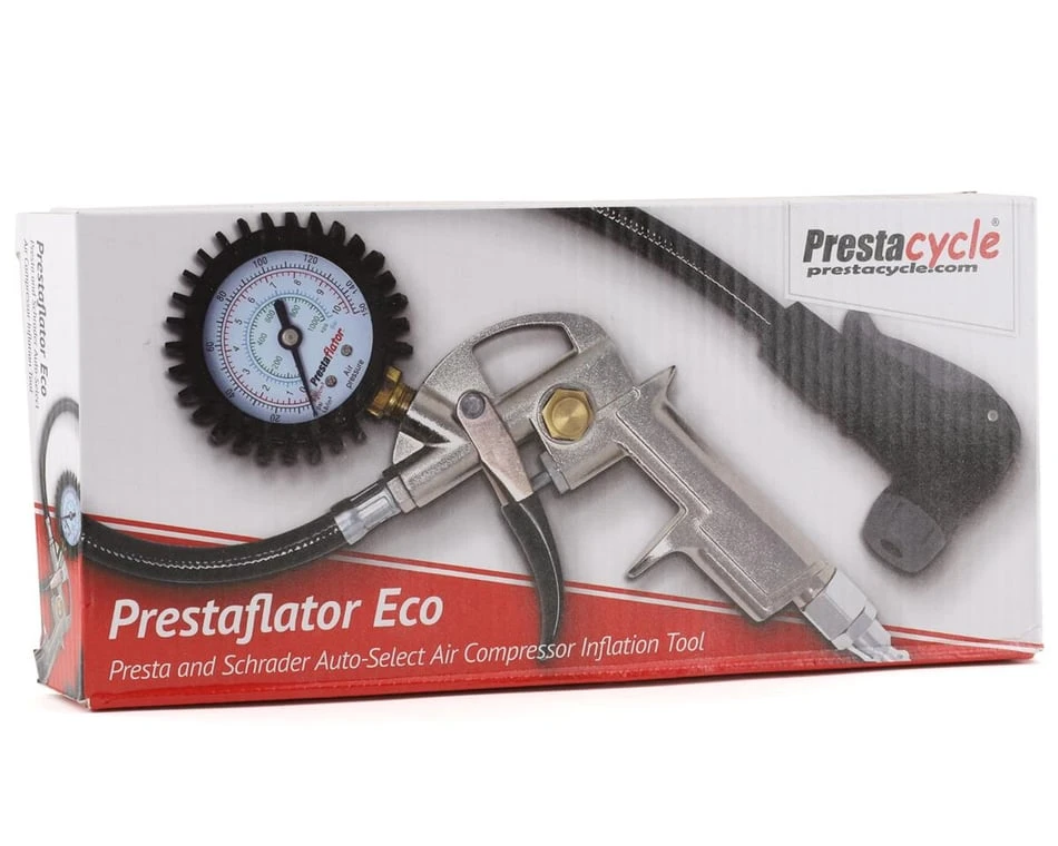 The Prestacycle Eco Air Compressor Inflator is designed with a medium flow trigger to provide a large enough blast to seat tubeless tires yet be able to adjust pressures on a micro level. Constructed with a cast alloy body and a PVC reinforced hose, the Prestaflator Eco is durable and accurate.