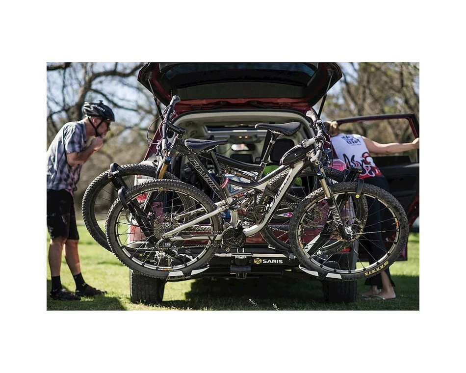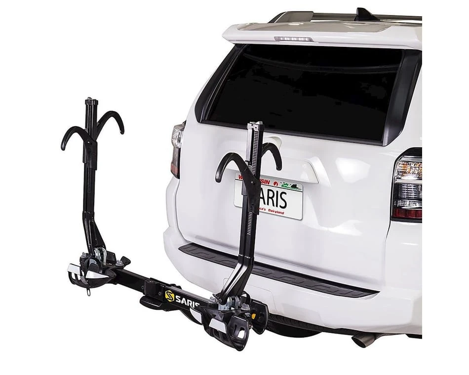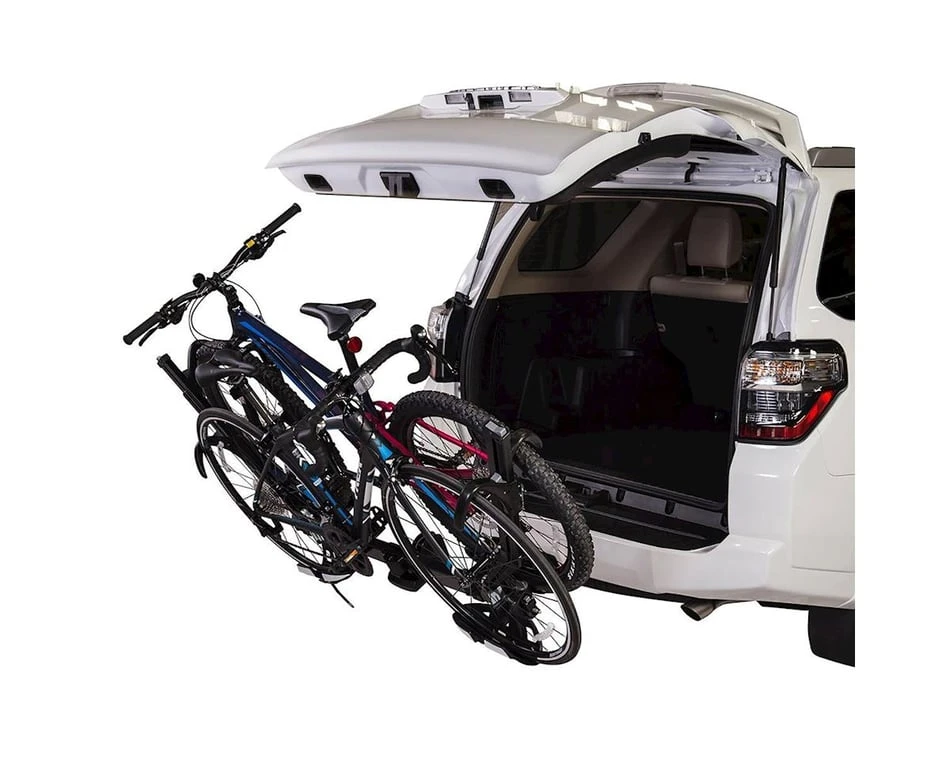 Saris’s SuperClamp hitch rack just got that much better with the SuperClamp EX edition. The SuperClamp EX utilizes the dual shepherd’s hooks on the front and rear wheels to securely fasten two bikes without any frame contact so your bike keeps its pristine condition. This hitch rack also has the ability to tilt away from the car, even with the rack fully loaded, for easy access to the trunk door of your vehicle. When the rack isn’t in use, it folds up and out of the way.