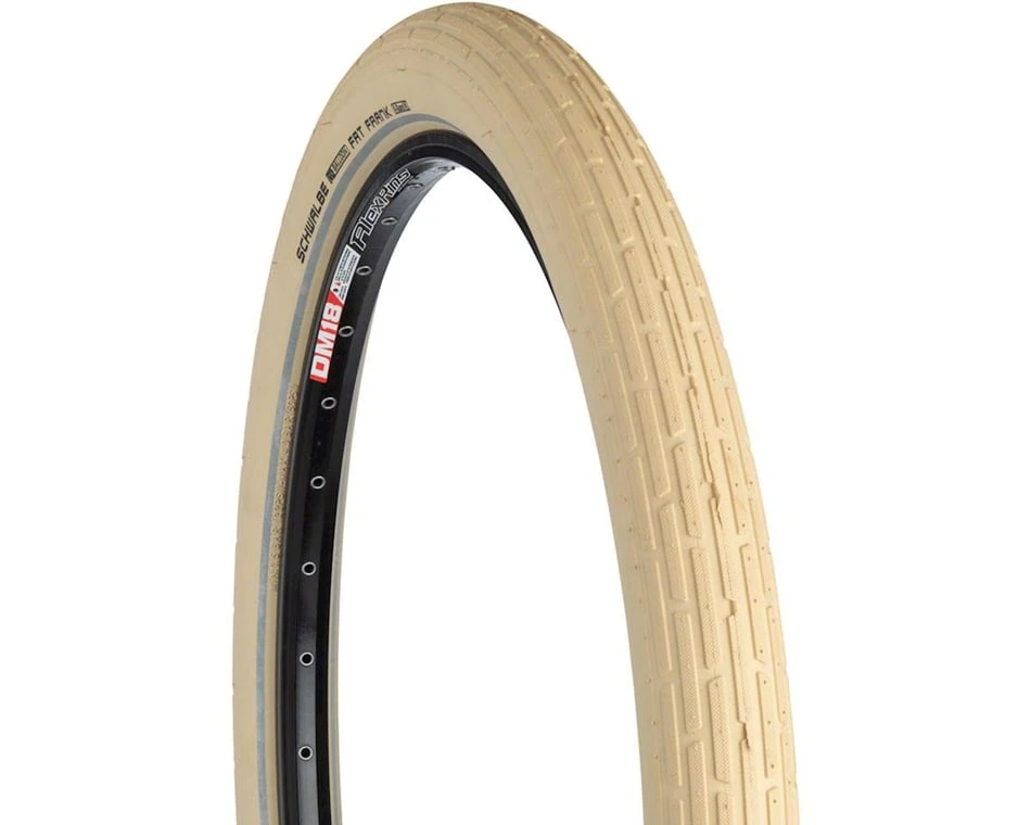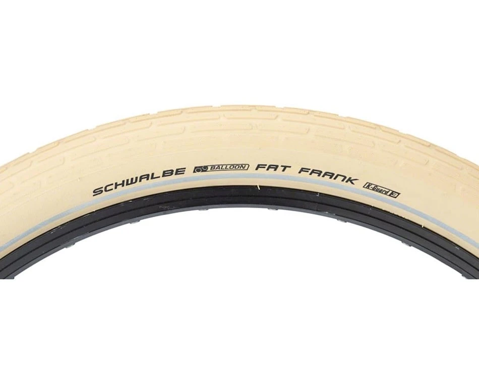 This is the Schwalbe Fat Frank K-Guard Wire Bead Tire, in SBC rubber compound. The Fat Frank from Schwalbe is a cruiser tire for “balloon bikes” that gives your cruiser an incredibly seductive look. The large volume air cushion tire provides a smooth rolling ride, while allowing for the sensation of suspension and dampening, absorbing the bumps in the road so you don’t have to feel them. The addition of K-Guard casing provides puncture resistance at the lower inflation levels required to get that awesome balloon tire effect.