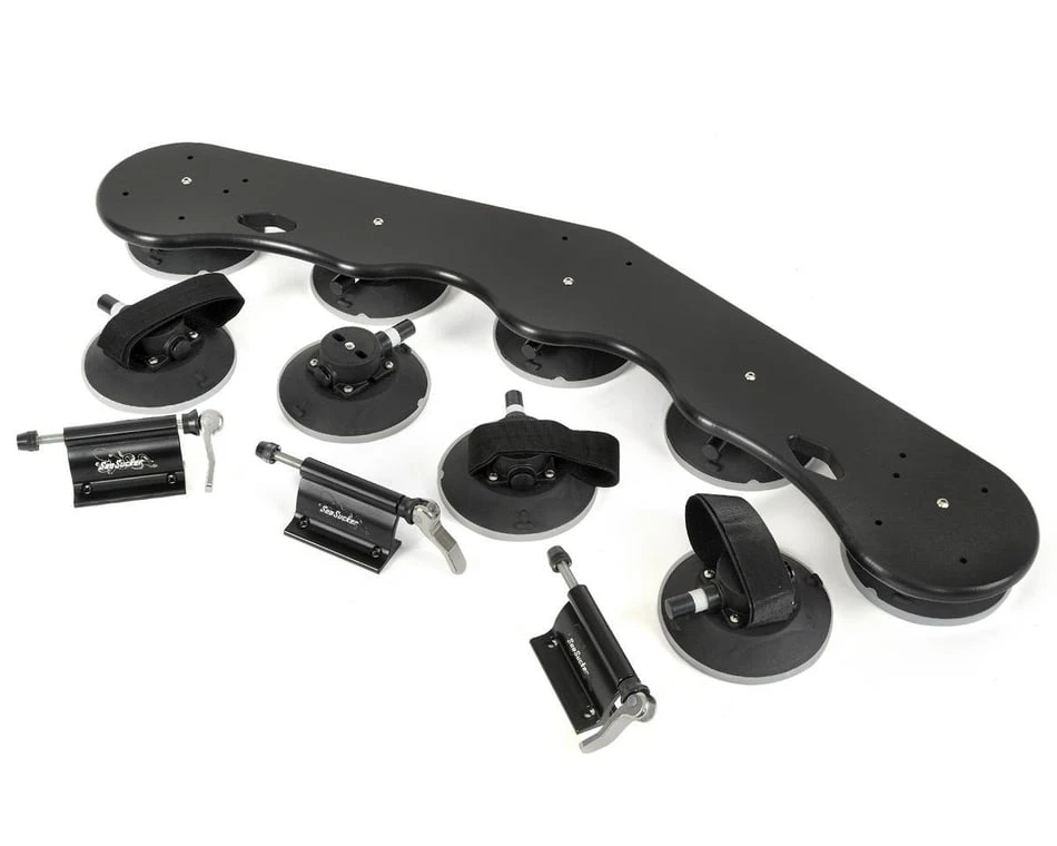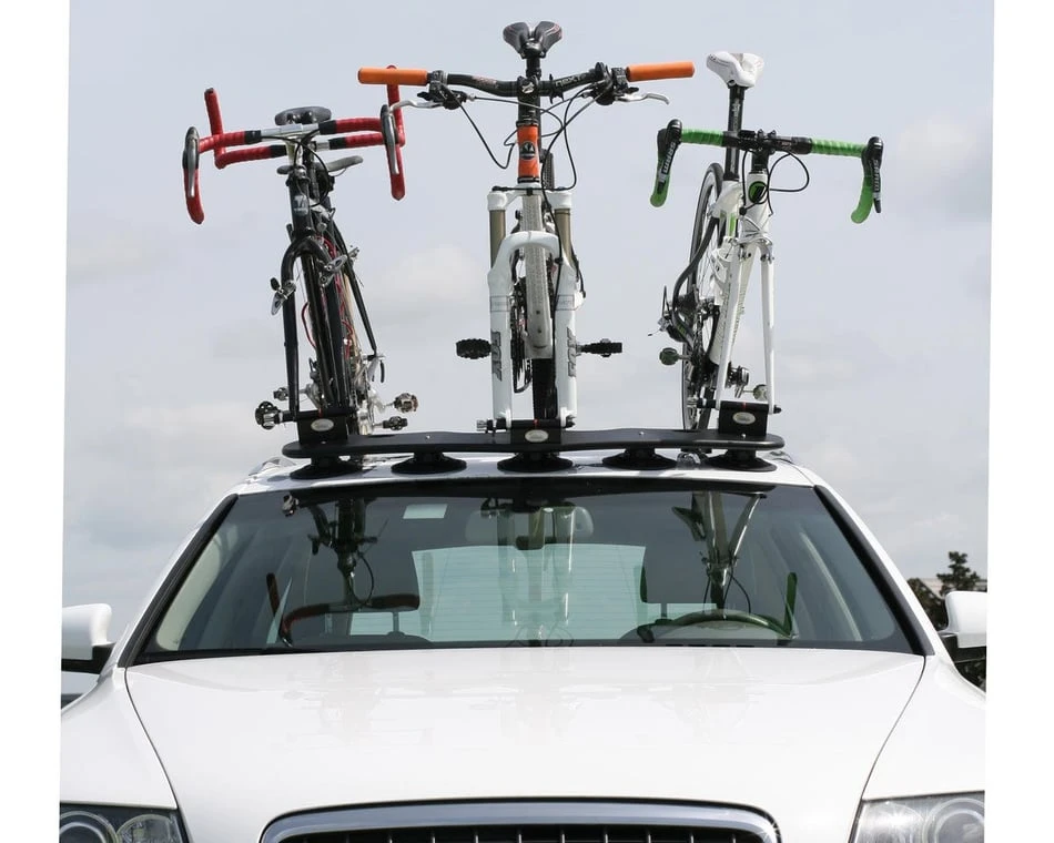 The Bomber is Sea Sucker’s 3-bike carrier. It’s a fork-mount-style rack, with five of their powerful (210lb pull-strength rated each) vacuum cups holding it onto your car’s roof, trunk or back glass. Three Rear Wheel Straps for holding the back tires in place are included. Incredibly easy to install, and removes in just seconds without marking your car. Fits on virtually any car. Comes with a 1-year warranty on materials and workmanship. Some assembly required.