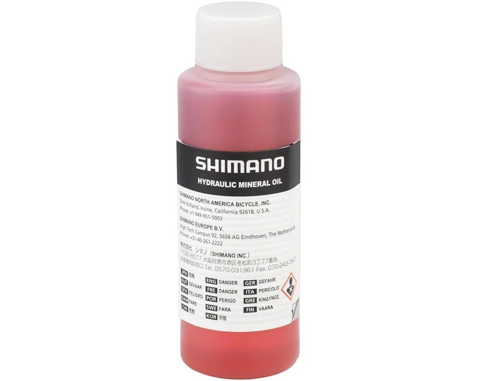 This is a bottle of Shimano Hydraulic Mineral Oil for Disc Brake Systems. Shimano hydraulic mineral oil is formulated for the proper maintenance of Shimano hydraulic disc brakes – Shimano recommends that you use only genuine Shimano hydraulic mineral oil in Shimano hydraulic disc brake systems. Mineral oil brake fluid is environmentally safe and non-corrosive.