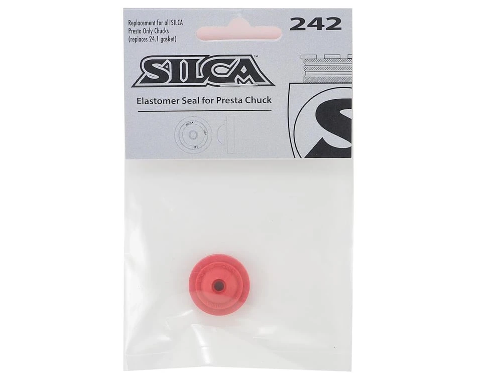 The Iconic SILCA 24.1 gasket has been updated and improved after more than 30 years in the market. The new 242 gasket utilizes a high tech and very red, fully synthetic elastomer base material rather than a carbon black filled natural rubber of previous gaskets. This unique bright red gasket borrows from industries which require air-tight seals in the harshest of environments, and tests to a life expectancy of more than 5X the carbon filled rubber or Buna-N materials used previously. New Two-Stage seal geometry seals on both valve stem and at the base of valve core threads resulting in a more positive seal and improved durability. The new gasket slips onto the valve stem with a satisfying ‘click’, while unique internal geometry actually utilizes line air pressure to compress the gasket onto the valve stem: the higher you pump, the harder it grips the stem!