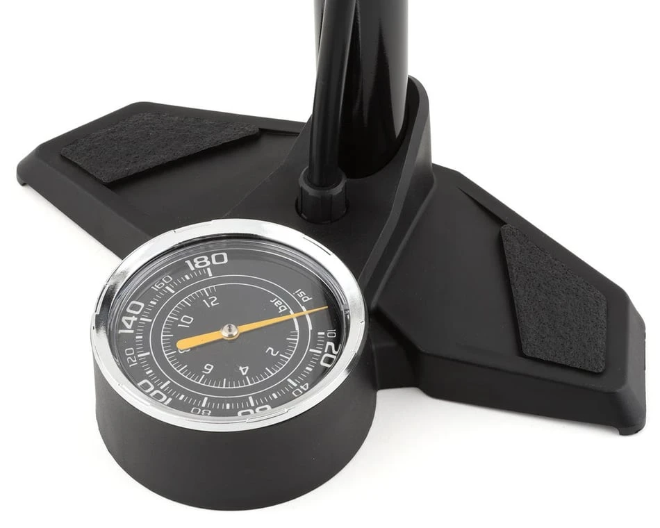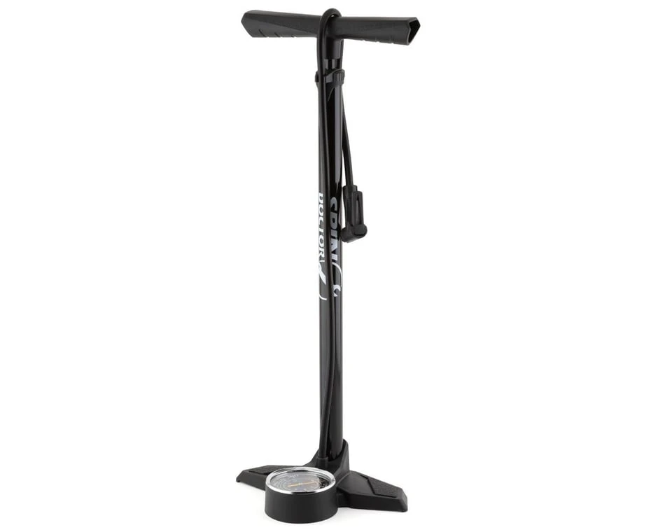 Quick and easy is what the Spin Doctor Essential Floor Pump is all about. The chuck utilizes an easy to use quick lock lever so you can be pumping up your tires in seconds. An easy-to-read base-mounted gauge, a sturdy steel construction, dual Presta/Schrader head, and comfortable handle round out this package for a no-nonsense, value-packed floor pump.