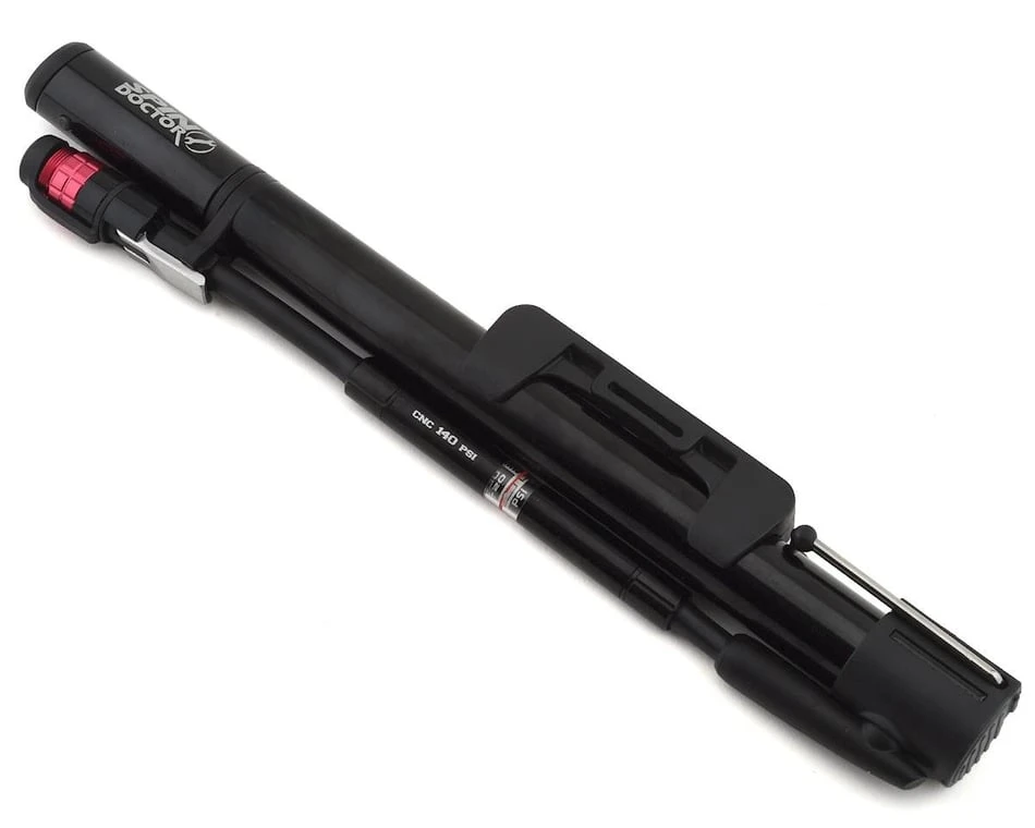 The Spin Doctor Mini Blast Pump is a great lightweight pump that you can attach to your frame while riding. This pump has an impressive max pressure of 140psi to help you fix that flat and get back to your adventure. The Mini Blast has a barrel made of lightweight and durable CNC Machined Aluminum, a telescoping hose, an easy to read inline gauge, and features a hi-Q Twin Valve to easily switch between adapters for Presta or Schrader valves.