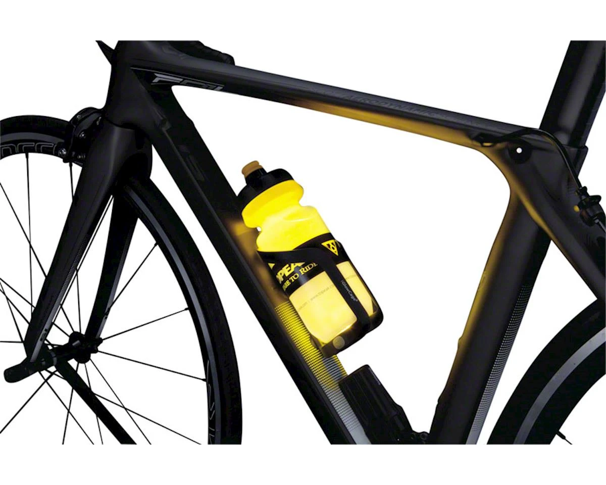 The iGlowCageB offers the ingenious integration of a super bright RGB LED into the water bottle cage with multiple choices of color to illuminate the clear bottle for 360 degree visibility.