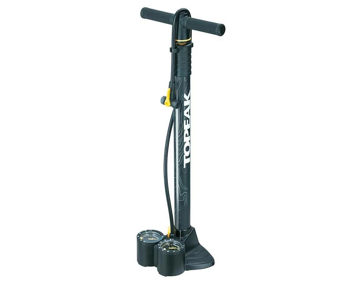 If you have a fat bike in your bicycle quiver then the Topeak JoeBlow Dualie floor pump is just what you need for easy, efficient, and accurate tire inflation. This clever dual-gauge floor pump was exclusively designed for low pressure fat bike tires as well as moderate pressure mountain bike tires. A 30 psi (2 bar) gauge shows precise low pressure readings for fat bike tires while the 75 psi (5 bar) gauge shows higher pressures for general use on general mountain bike tires. Additionally, a massive oversized barrel is 1.5 times larger than a standard floor pump and delivers large air volume to fill oversized tires quickly.