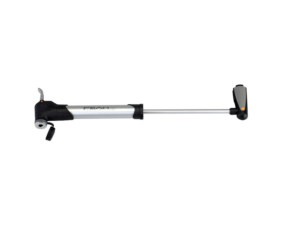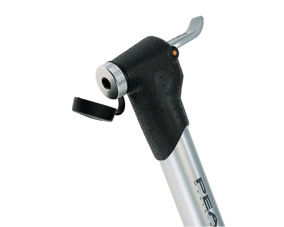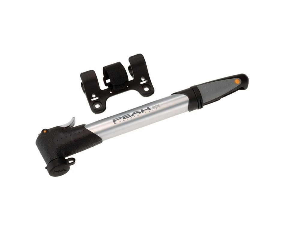 The Topeak Peak DX II Mini Pump features a padded elastomer T-handle and head to provide comfortable purchase while inflating. An aluminum barrel adds style plus durability and the SmartHead automatically adjusts to fit Presta and Schrader valves. Includes mounting clip.