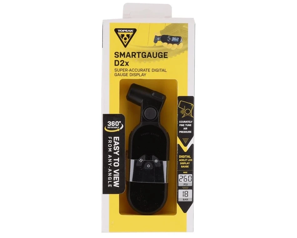 The Topeak D2X SmartGauge is a digital air pressure gauge that works with both Presta and Schrader valves for tires, shocks, and forks.
