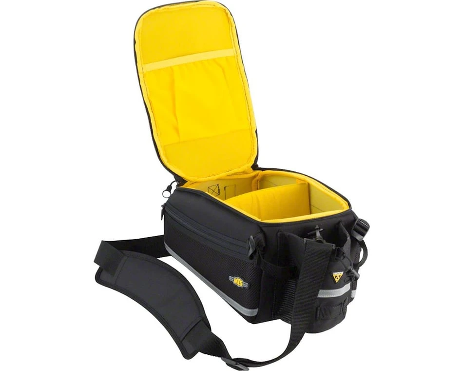 The Topeak TrunkBag EX is made of dual molded side panels combined with flexible 600 denier fabric to form a semi-rigid, weather-resistant trunk bag. The TrunkBag EX features a divided main compartment with mesh side compartments and rear water bottle holder. This version attaches with integrated straps making it compatible with nearly every type of rear rack.