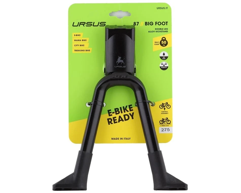 The URSUS Big Foot center-mount kickstand is an alloy double kickstand that has the capacity to hold up to 120 lbs making it suitable for bikes with extra cargo or a child seat. The plastic feet on the Big Foot kickstand are extremely strong and prevent the stand from slipping while in use. Big Foot is designed to work with 700c/28″ wheeled bicycles.