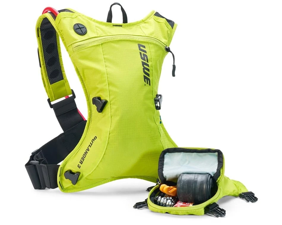The USWE Outlander 3 is a lightweight race hydration backpack with a super smart external on/off organizer pocket for tools and gear. This unique on/off solution makes it possible for you to strip off the pocket and go superlight (2L) when you’re in that race mode. Fitted with the award winning No Dancing Monkey™ 4-point harness that makes the pack 100% bounce free in action.