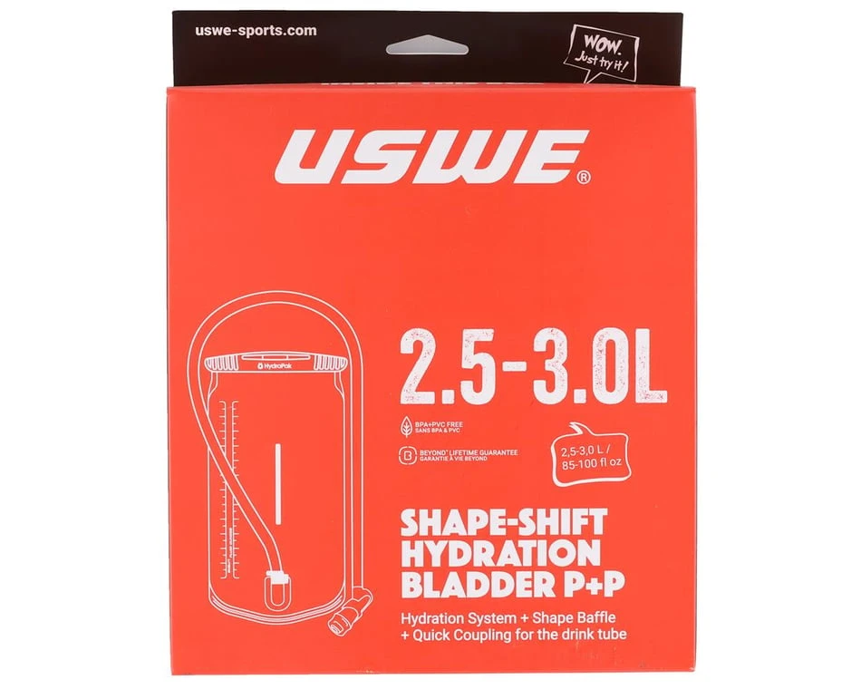 The USWE Shape-Shift hydration bladder adds a versatile baffle to an already renowned hydration system. The baffle can be zipped to slim the bladder profile or unzipped to increase fluid volume or reverse to clean and dry. The patented super-wide slide top opening makes it easy to load up with ice on hot days and turn inside out to clean when your adventure is complete.
