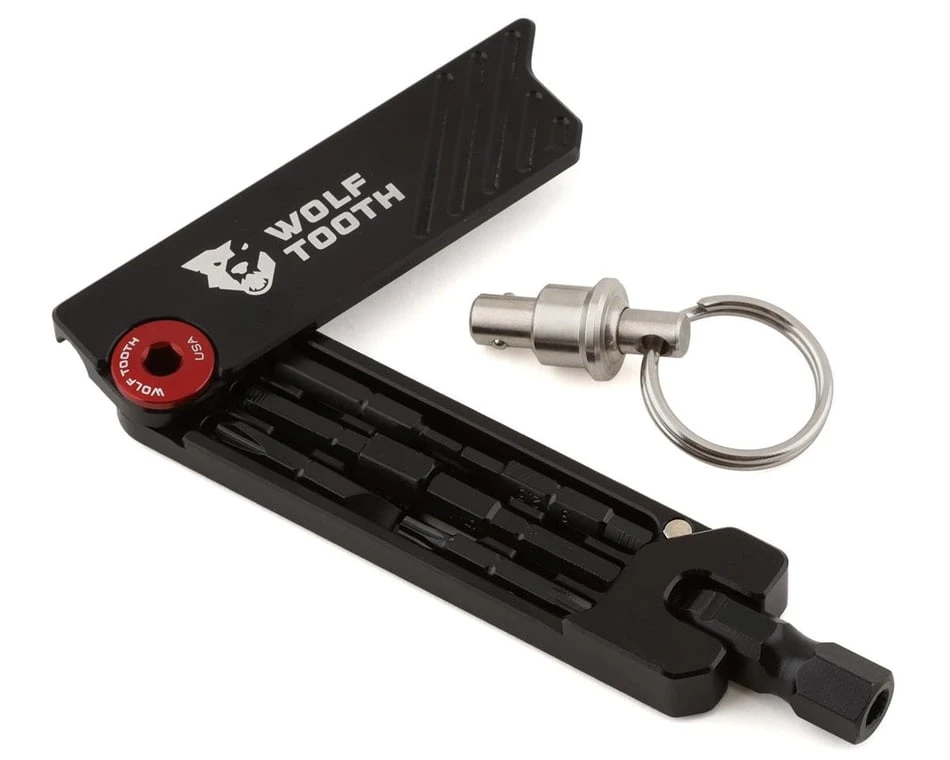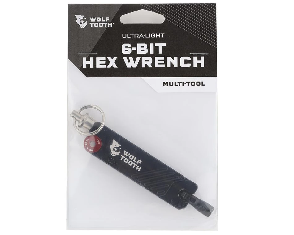 The Wolf Tooth Components 6-Bit Hex Wrench Multi-Tool With Key Chain has 11 essential tools stored inside a compact handle attached to a key chain so you never have to worry about being caught without necessary tools. All bits are ED-coated and corrosion-resistant. It is small enough to fit into a riding tool wrap or pocket, and has a swiveling keyring attachment to fit on any keychain for everyday use.