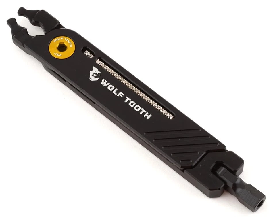The Wolf Tooth 8-Bit pack pliers represent a new wave of on-the-go multitools. With lightweight machined aluminum construction and 17 different functions, trailside repairs will become a breeze. Eight attachments nest inside the handles of masterlink pliers using magnets and then fit into an 8mm ball dent swivel head for outstanding functionality.