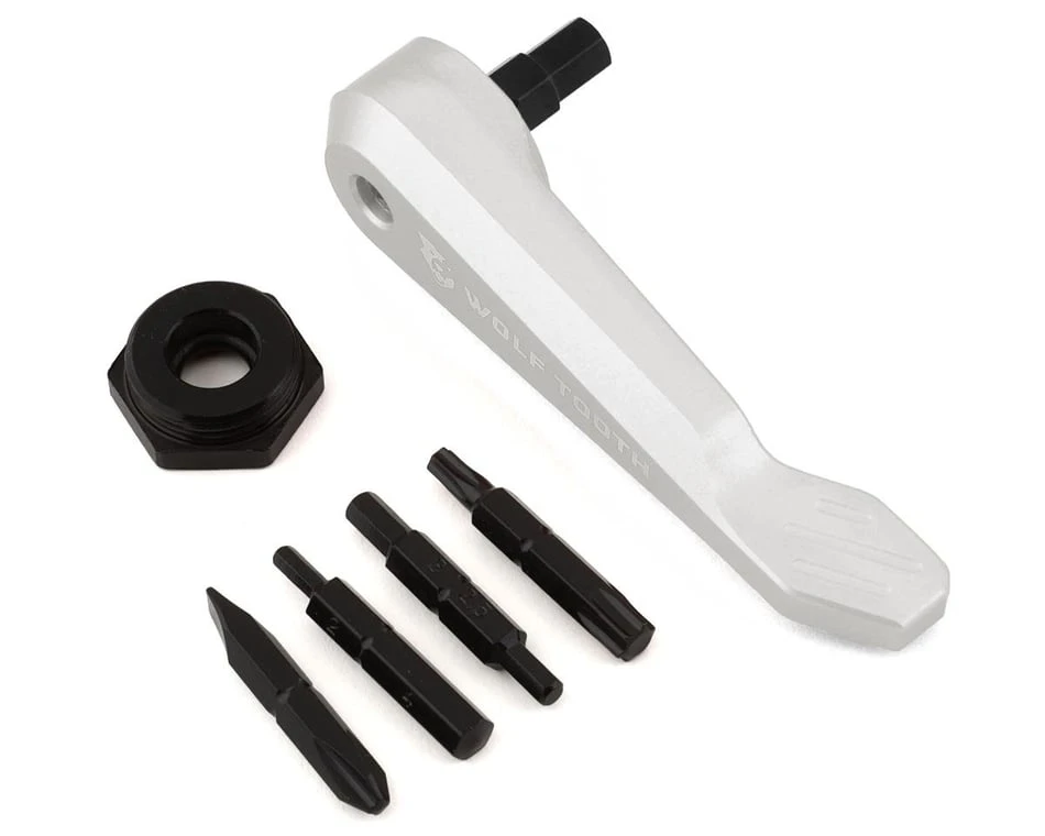 The Wolf Tooth Components Axle Handle Multi-Tool is an innovative tool that has 10 tools stored inside the handle of the Wolf Tooth Thru Axle Handle, allowing you to easily install or remove your thru axle while ensuring you have essential tools at hand.