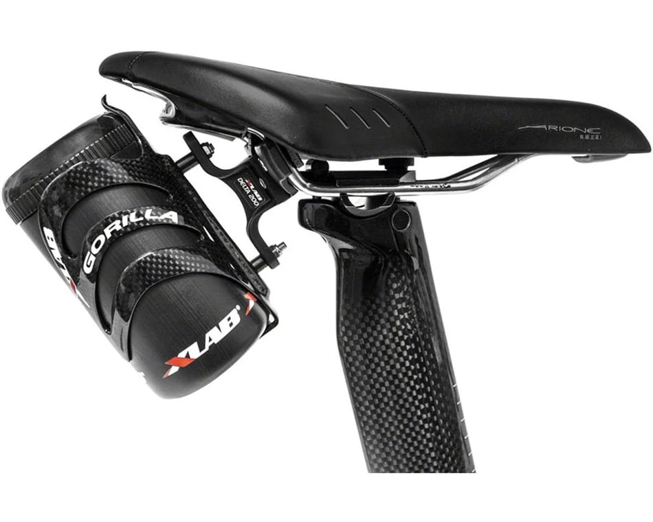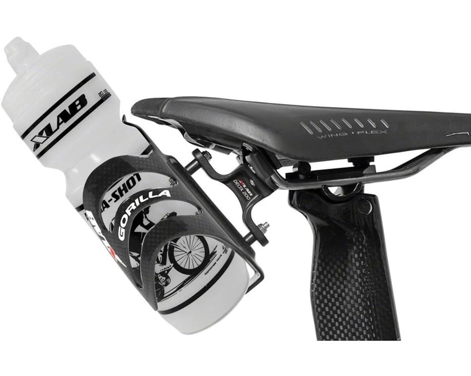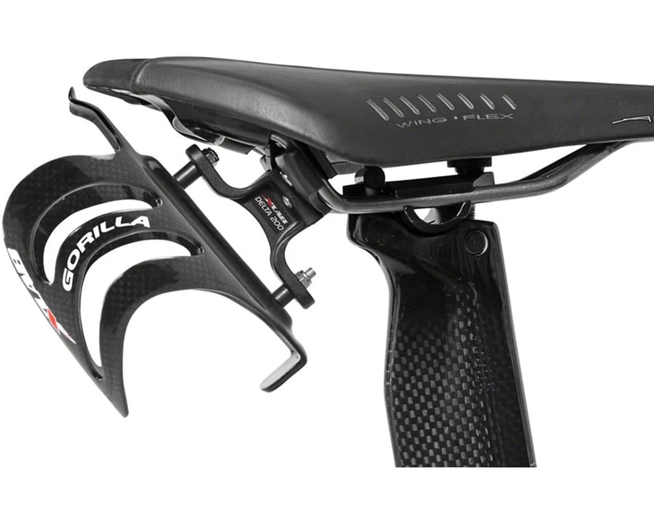 The X-Lab Delta 200 Rear Water Bottle Cage is a saddle-mounted single bottle system. Mounting a bottle to saddle rails rather than traditional frame mounts has been shown to cut down on aerodynamic drag.